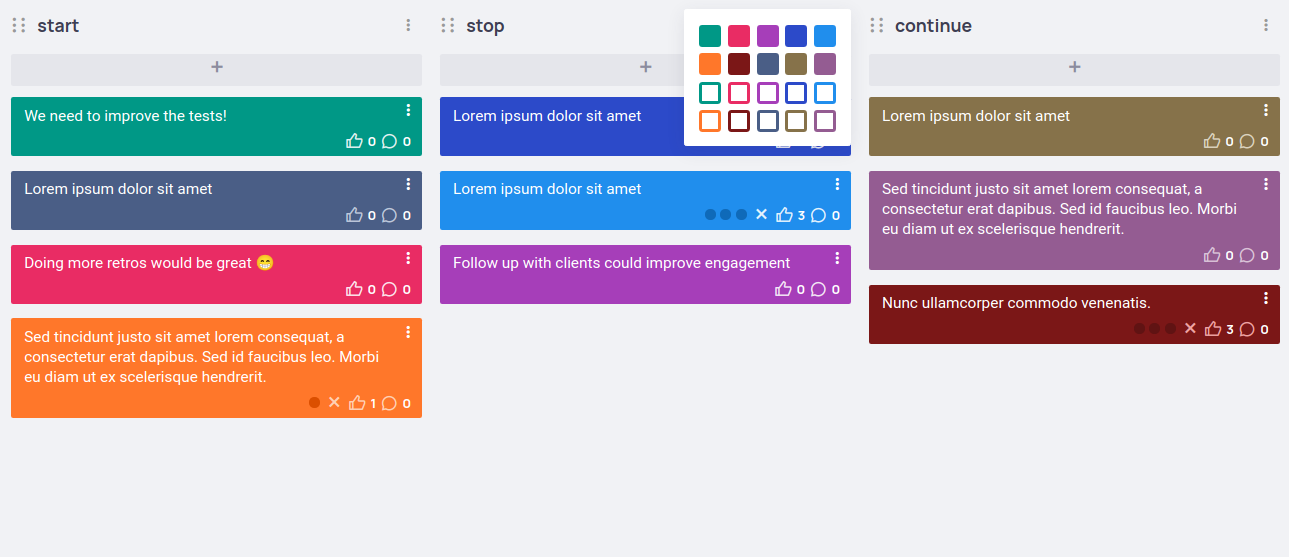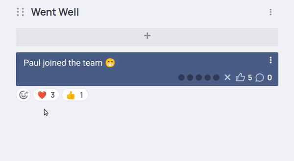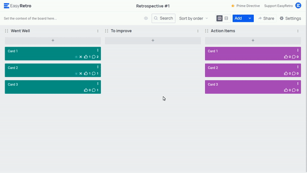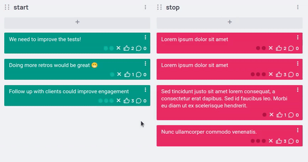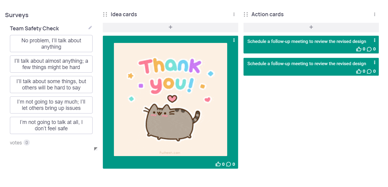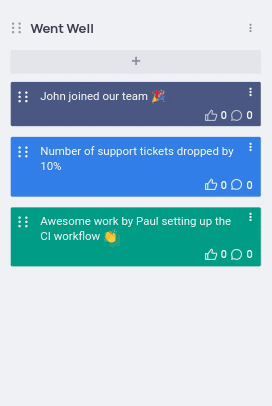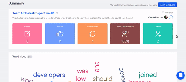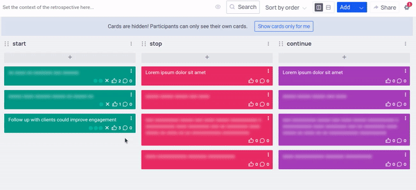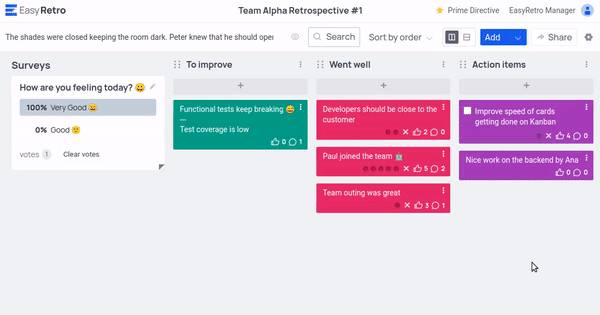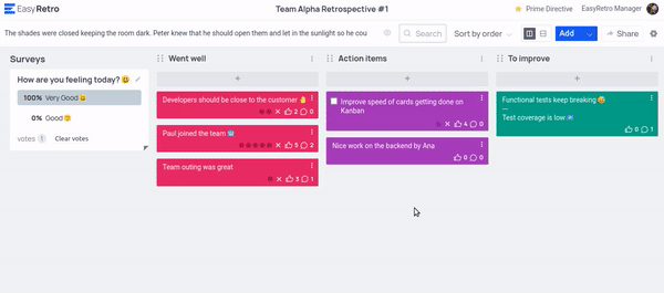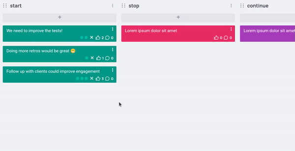 When you clone the content of a board, you will now have the added benefit of cloning its surveys as well. This improvement makes it much easier to kick-start your next retro without having to recreate the surveys from scratch.