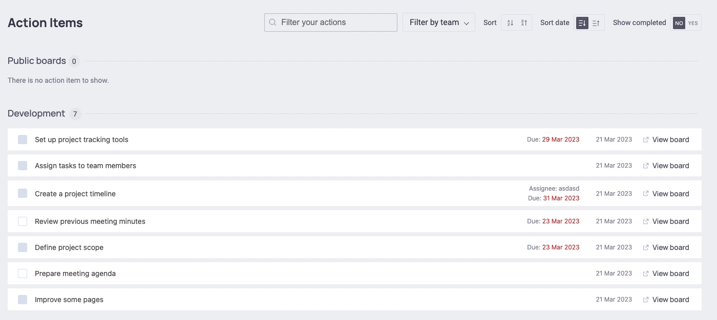 Filter action items by teams. Easily view and manage tasks for specific teams, streamlining workflows and enhancing collaboration.