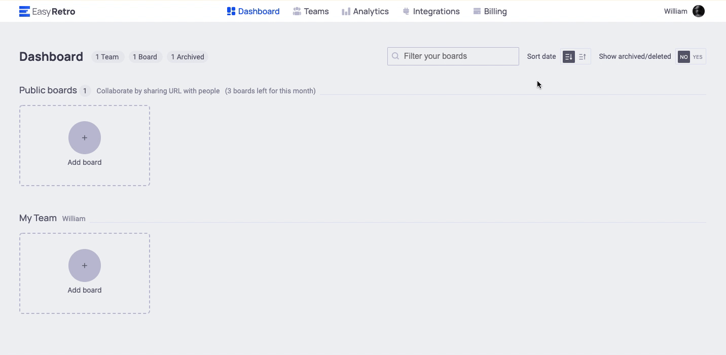 With this enhanced feature, it's easier to find boards created by a particular team member, even if their name is common or misspelled. Simply type in their name or email into the search bar located at the top of the Boards page, and EasyRetro will instantly display all the boards that the user has created.